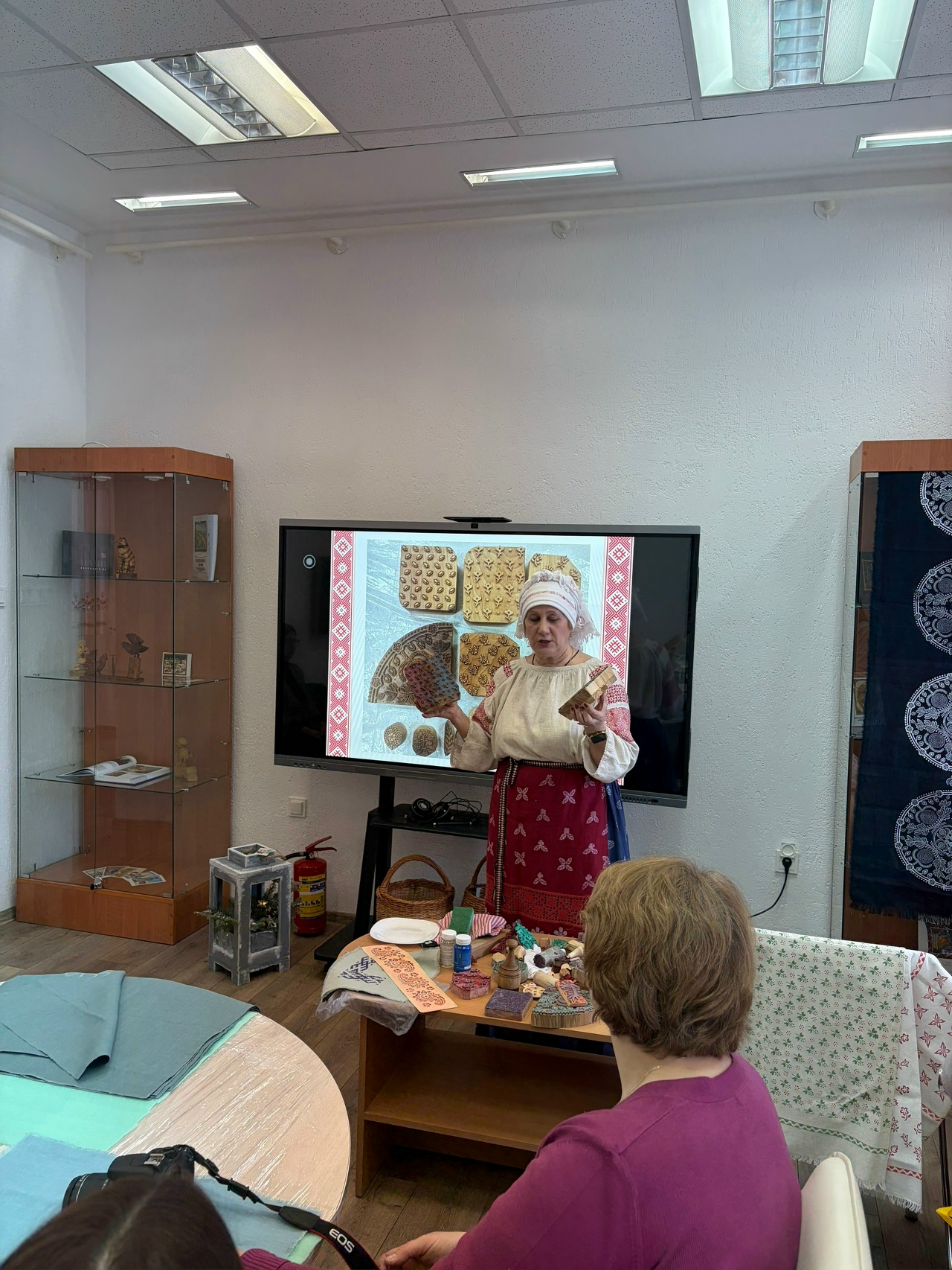Пра асновы і майстэрства прафесійнай набойкі на тканіне паведаміла Самусенка І.М., загадчык філіяла “Дом рамёстваў” ДУ “Лёзненская цэнтралізаваная клубная сістэма” і правяла майстар-клас для ўдзельнікаў сустрэчы.